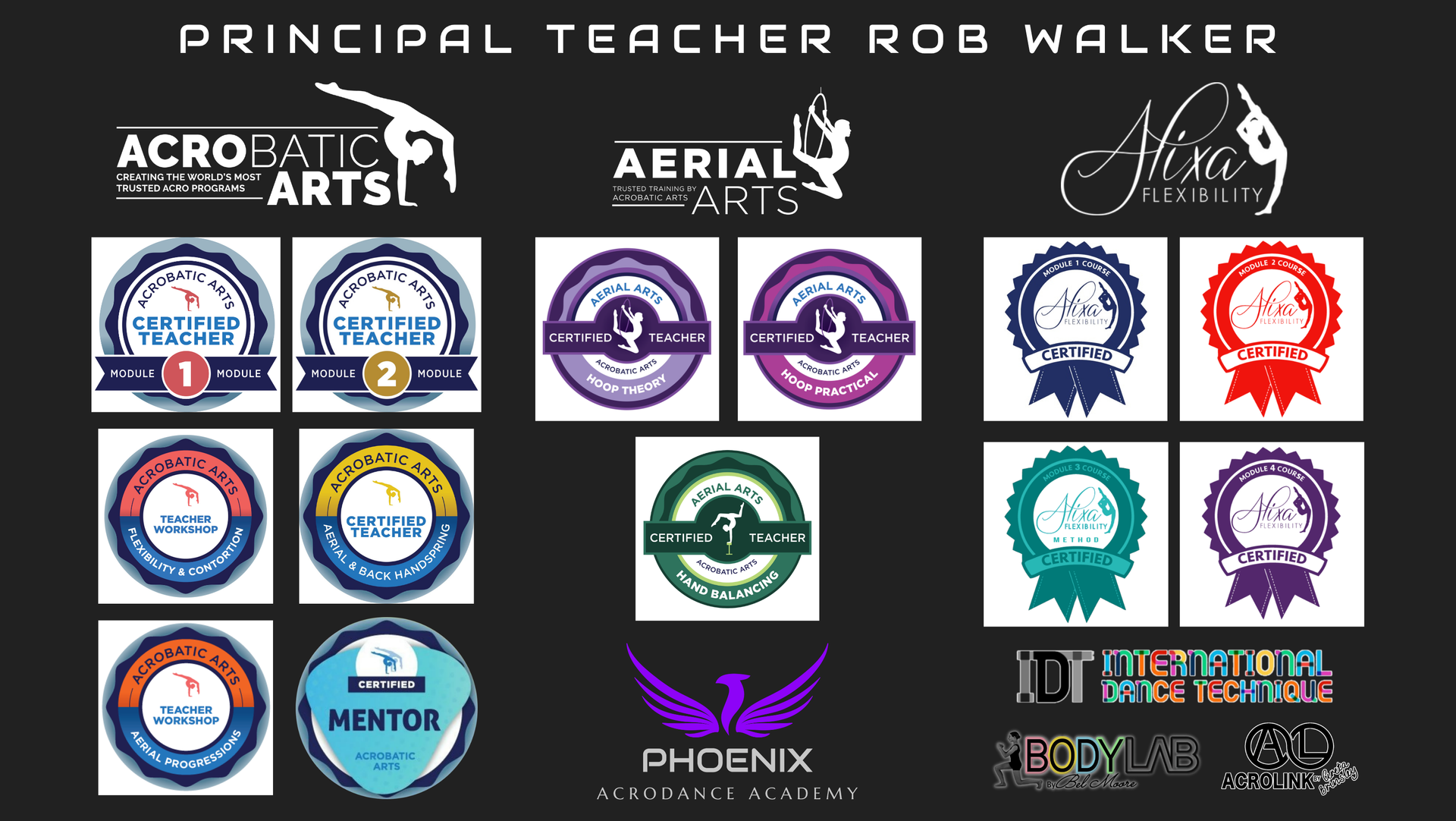 In May 2018 Rob became a Certified Acrobatic Arts Teacher & in September 2018 he opened Phoenix AcroDance Academy. After further training over the years since 2018, Rob became a Mentor for Acrobatic Arts Assistant Teachers, also a Certified Module 2 Acrobatic Arts Teacher with 'Distinction' for his practical & written exams, Certified Alixa Flexibility M1, M2, M3 & M4 Teacher, became a teaching member of International Dance Technique (IDT) & BodyLab Conditioning Programme. Rob has also passed with high marks to be an Aerial Arts Certified Teacher with over 1 and a half years of practical support teaching and rigging experience prior of being certified.